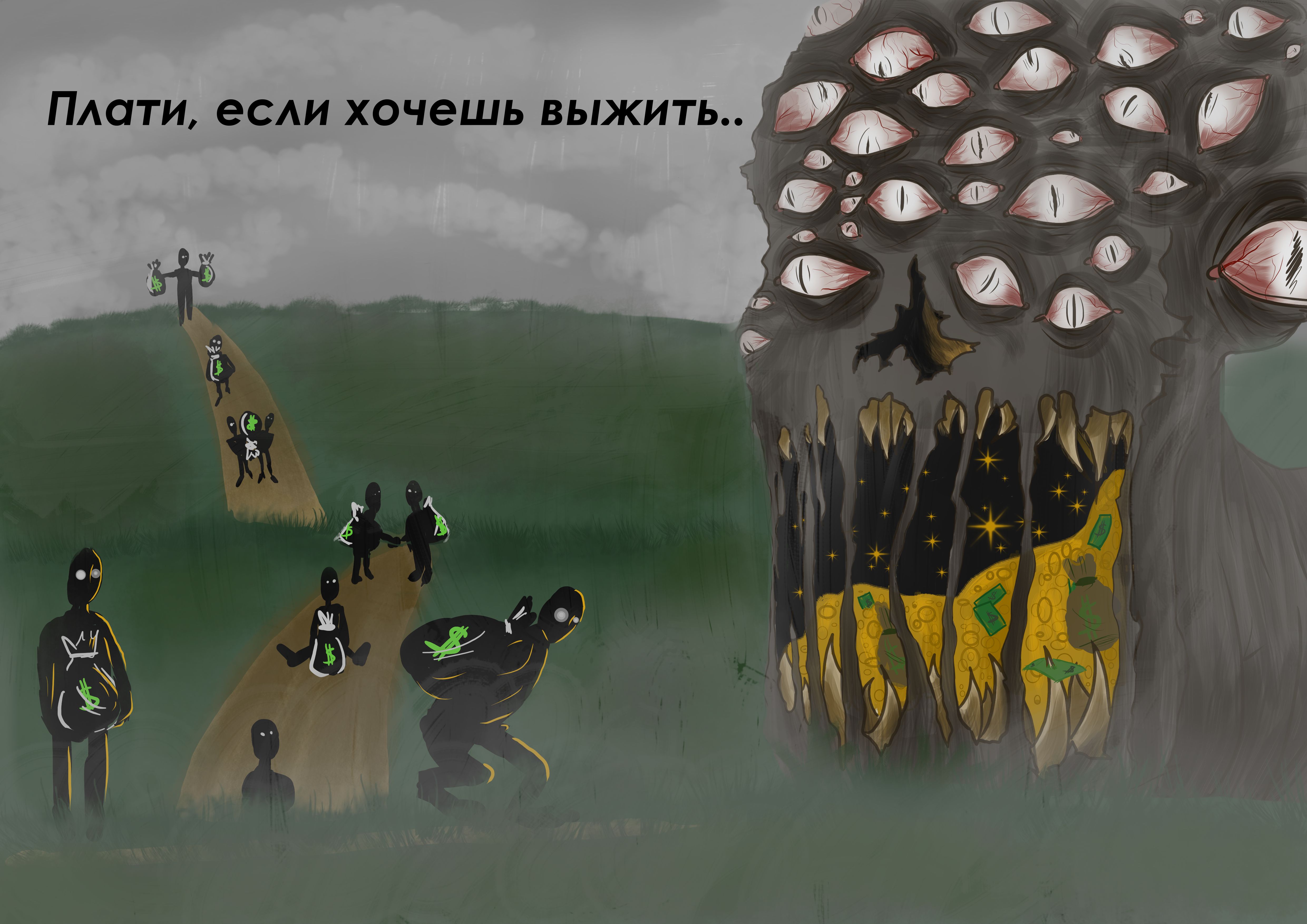 Моя работа представляет собой олицетворение того, как люди платят "Налоги" и всё в таком духе. Многоглазый монстр - это то, как я вижу Государство и всех тех, кому мы отдаём свои деньги. Много глаз как бы показывает то, что они следят за всем что происходит с нами и вокруг нас, тем самым контролируя ситуацию.