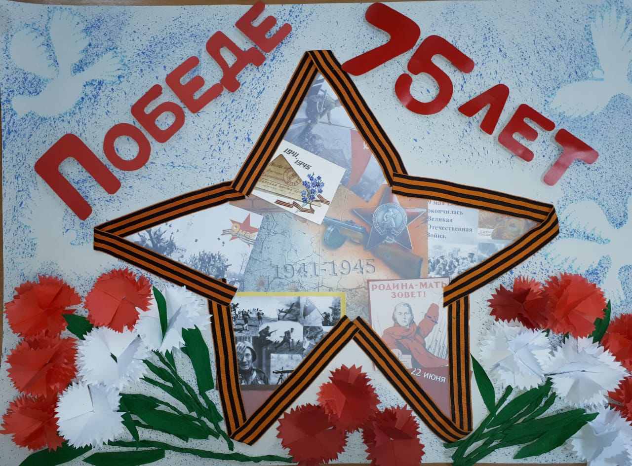 Плакат «Победе 75 лет». Коллективная работа педагогов МБОУ «СОШ N 2 г. Невельск». Работу выполнили Камнева Елена Вакильевна, Ворошилова Евгения Николаевна, Пудовкина Светлана Геннадьевна , Зеландз Галина Анатольевна, Проценко Татьяна Николаевна.