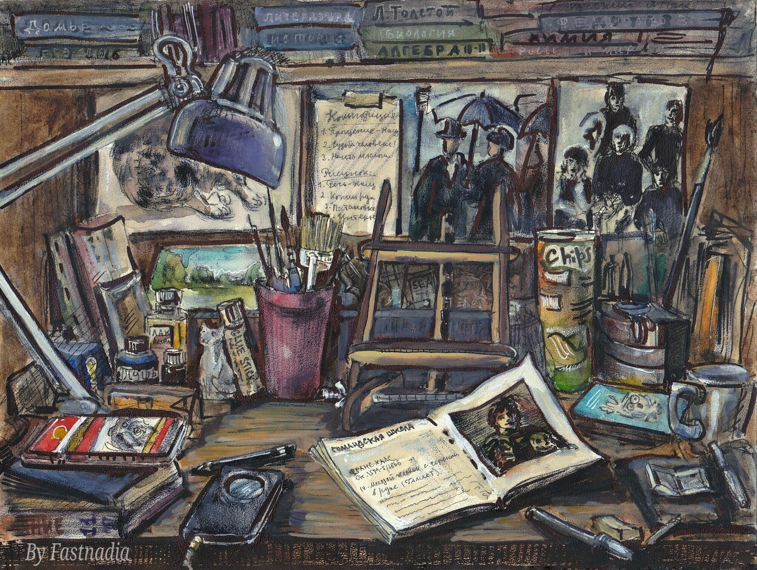 "Мой творческий стол", материалы: бумага, акварель, маркеры.
